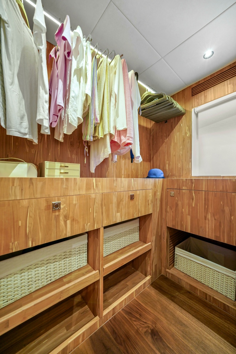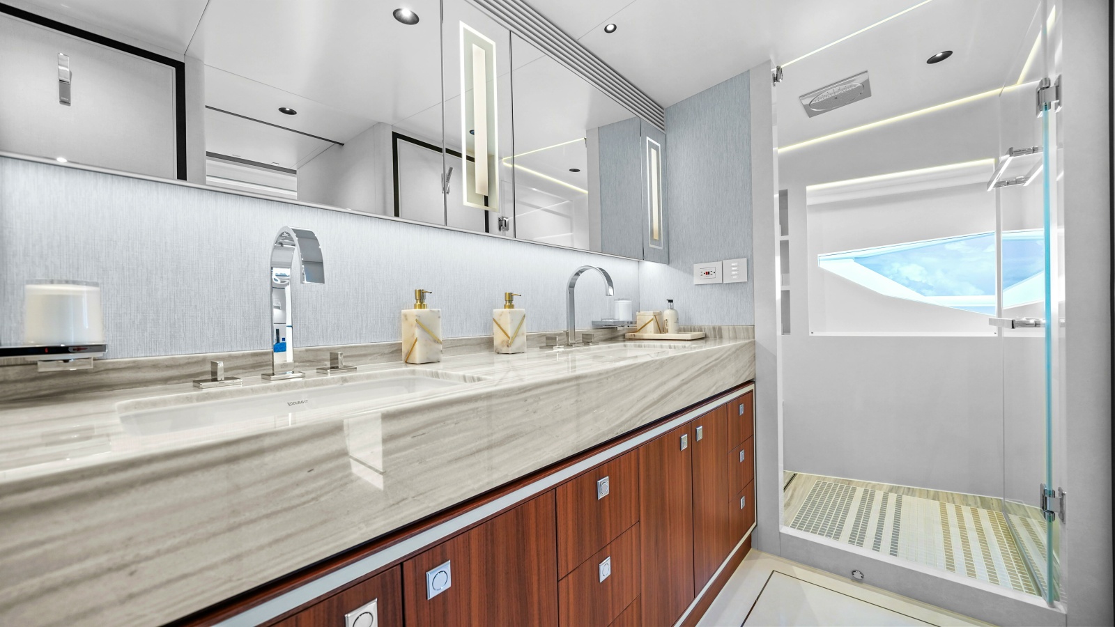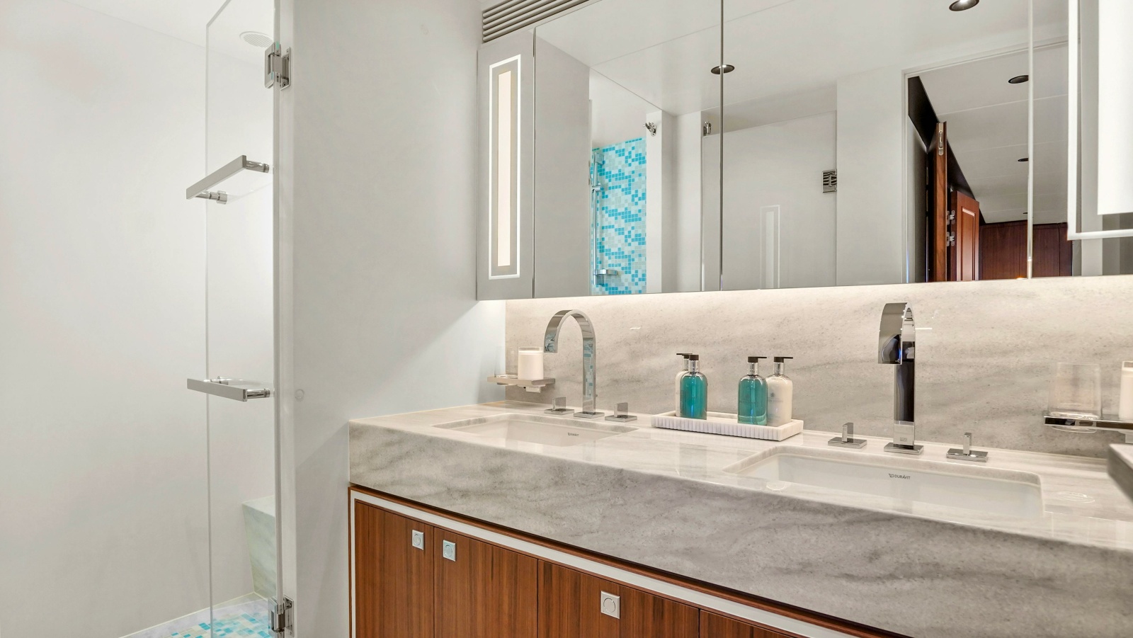 Below deck, three ensuite guest staterooms continue the yacht’s luxurious theme. A standout full-beam forward 2nd Master Suite features a king bed, walk-in closet, and double vanity. Each room is styled with its own mosaic color scheme and finished with warm walnut accents. Forward of the guest accommodations, three well-appointed ensuite crew cabins support a professional crew of up to six, including a Captain’s double cabin, two crew bunk rooms, and a crew mess.