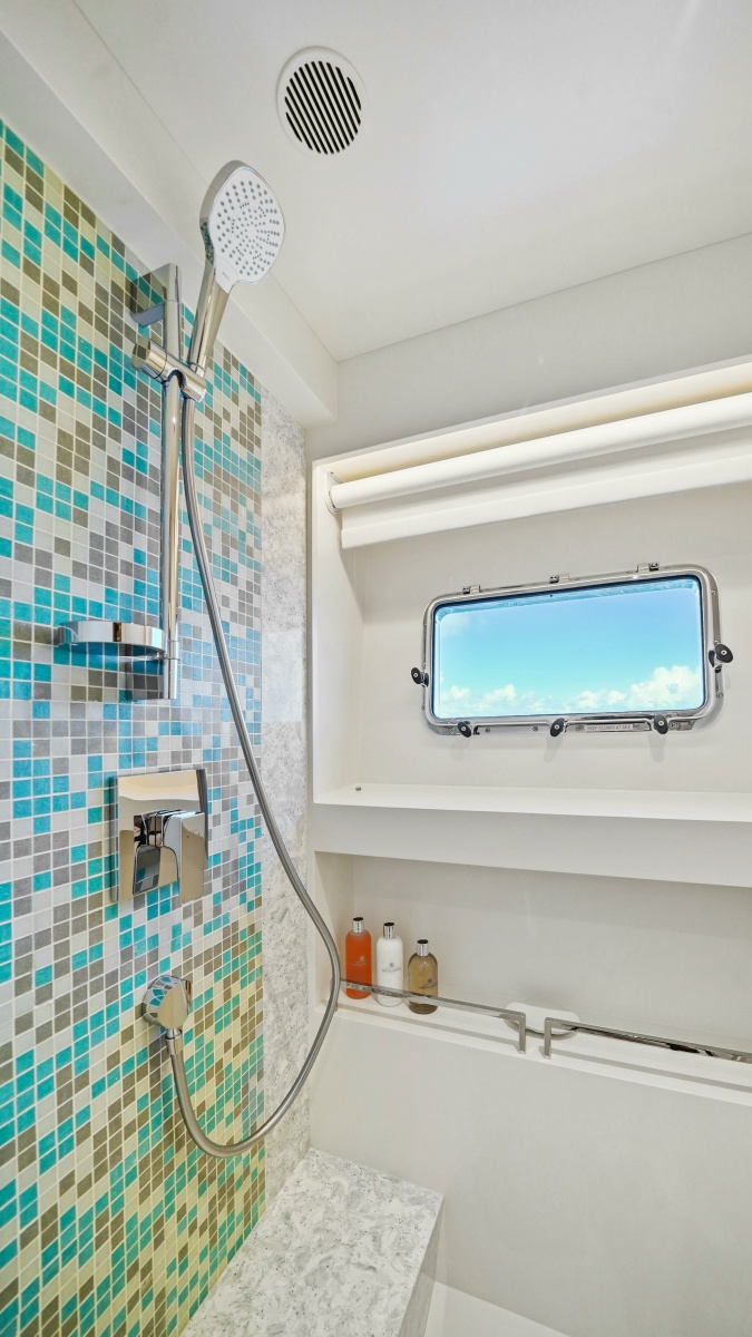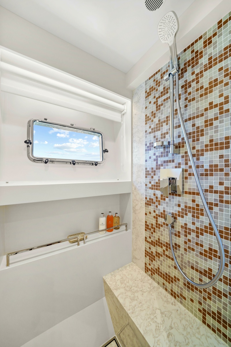 Tucked behind the engine room—equipped with twin CAT C32B 2,400hp engines and twin Northern Lights 65kW generators—the beach club is a multi-functional escape. This space features a central coffee table, sofa bed, two moveable chairs, and a 43” Hi/Lo TV, and can also serve as an additional stateroom complete with a full head and overhead shower.