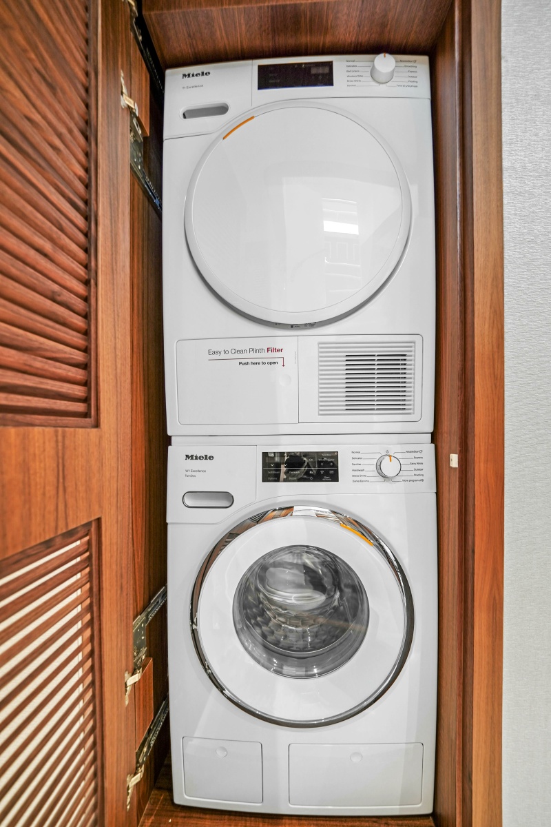 On the bridge deck, the raised pilothouse features a complete navigation suite and a custom Stidd helm chair, flanked by a custom raised Settee, providing a 360 degree view while seated. Aft, the flybridge presents a panoramic vantage point for enjoying open water, complete with a second helm station, a mosaic-tiled L-shaped bar with six barstools, and a large TV for outdoor entertainment. Culinary and service needs are met with a Sub-Zero wine cooler, refrigerator, ice maker, sink, and hidden 24" propane BBQ.