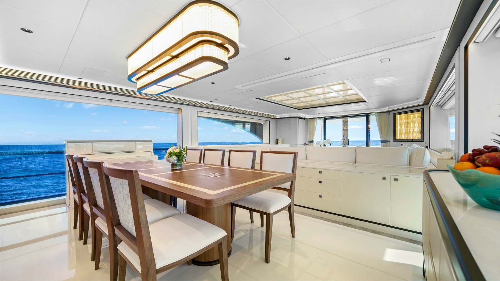 Formal dining aboard MISS MICHELLE is a centerpiece experience. A custom walnut table with sycamore, maple, and ebony accents comfortably seats 10, with bespoke armchairs at each end. An electric partition can discreetly separate the space from the main salon, while a carved-glass ceiling fixture framed in brushed carbon steel adds an artistic touch.