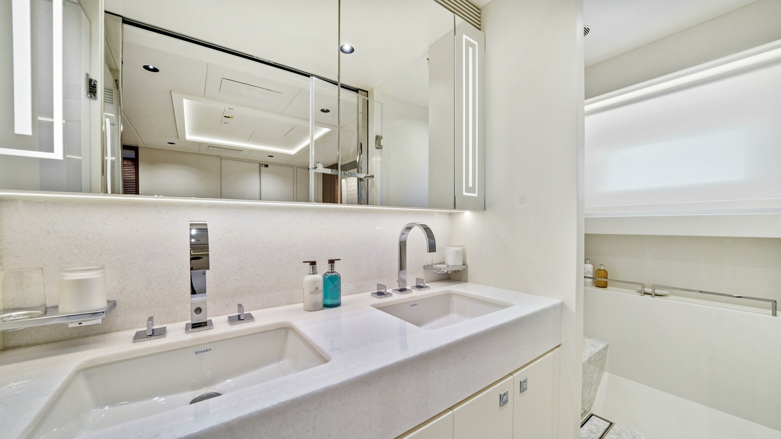 The main deck features a full-beam master suite designed for absolute privacy and comfort. A king-sized bed is framed by Corian White Onyx stone, and the space includes walk-in closets, a vanity, and a beautifully tiled ensuite bathroom with dual sinks. A mirrored ceiling detail adds dimension and height, while integrated wireless charging stations and a Hi/Lo coffee machine offer modern convenience within this tranquil retreat.