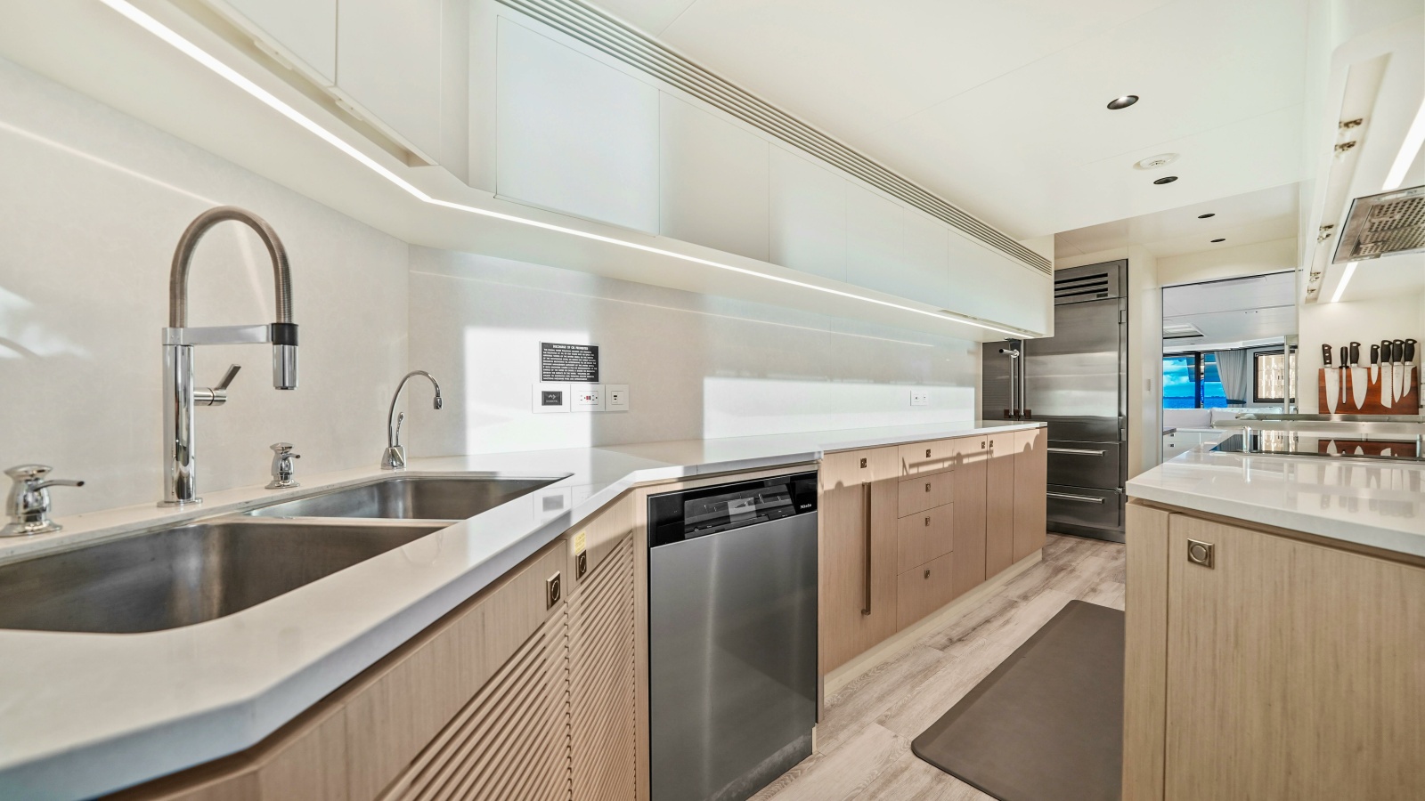 A mounted 85” Frame TV between the dining area and the galley offers dynamic artistic display. The galley itself, finished in bright Cambria stone and optimized for storage and function, invites culinary creativity and is tailored to the owner's preferences.