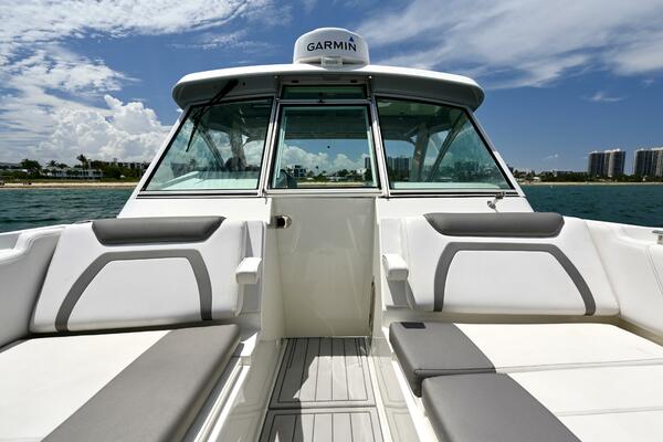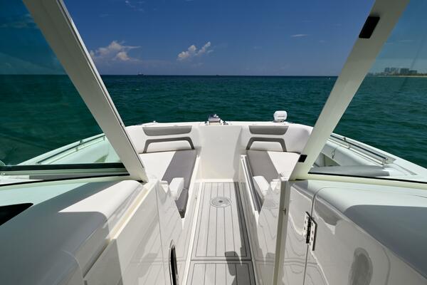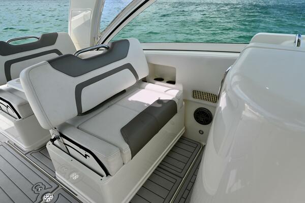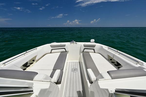 · Offset Walkway Between Consoles with Seating for Six on Twin Double-Wide Lounge Seats. Seats Have Angled Cushioned Backrests and Headrests. Port and Starboard Gunwale Inserts with (3) Cup Holders, Storage Bins, and Speakers