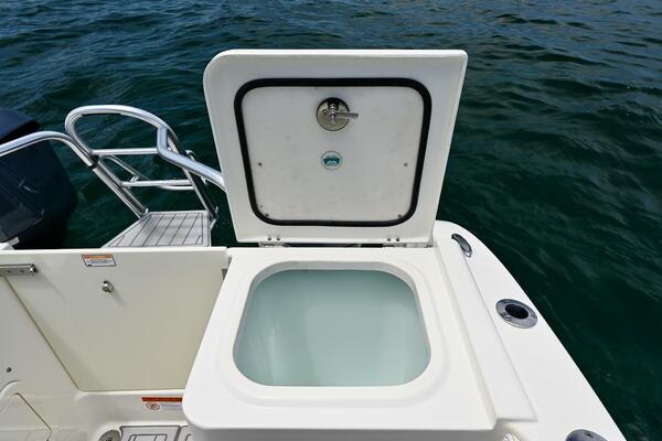 - Aft Starboard Transom Seating for Two Adults. The seat box Opens to Reveal a Storage Compartment