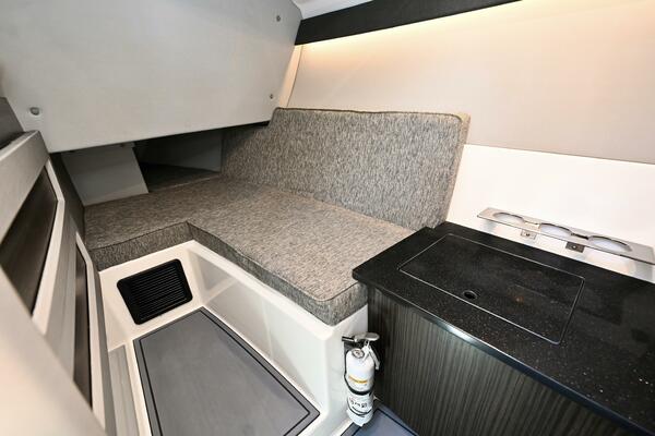 Below deck, you'll find a surprisingly spacious and well-appointed interior. The private stateroom offers a comfortable place to relax or store personal belongings, while the port-side head is equipped with high-end fixtures and finishes, providing convenience for longer days on the water.
