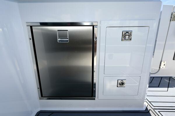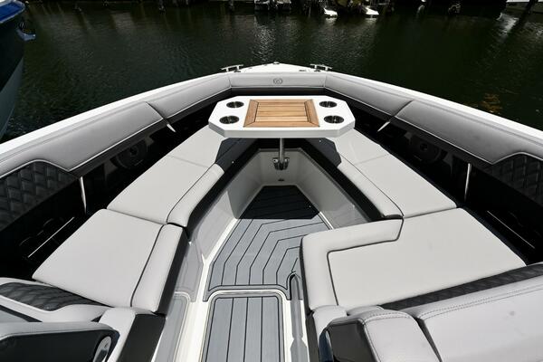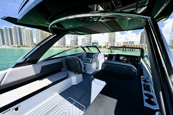 Above deck, the R33 features a sleek, modern hardtop that offers excellent protection from the elements without compromising the boat’s stylish profile. The spacious cockpit and bow seating areas are thoughtfully laid out with plush upholstery, ensuring your guests cruise in comfort. Stainless steel accents, integrated cup holders, and ample storage contribute to a clean, upscale feel throughout the deck.