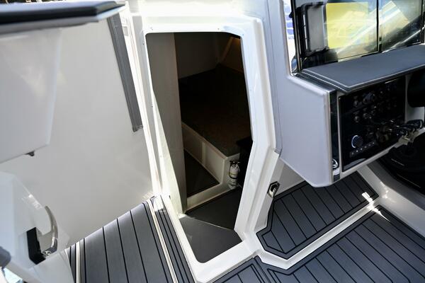 The starboard stateroom on the R33 Cobalt is a thoughtfully designed space that offers both comfort and functionality in a compact layout. Tucked below the helm, this private cabin features a cozy berth perfect for resting or escaping the sun during long days on the water. Soft-touch materials, ambient lighting, and well-finished cabinetry create a refined and inviting atmosphere. Ideal for a quick nap, storing personal belongings, or even an overnight stay, the stateroom adds a level of versatility rarely found on boats in this class—making the R33 as practical as it is luxurious.