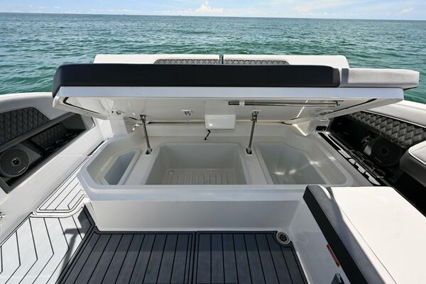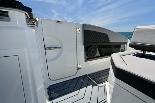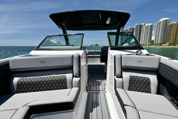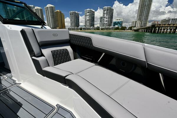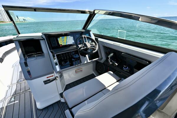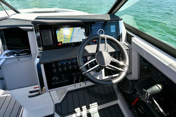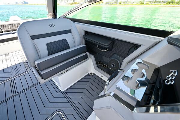 The helm of the R33 Cobalt is a sophisticated command center designed with both performance and comfort in mind. Featuring a sleek, automotive-inspired layout, the dash is finished with premium materials and intuitive controls. Dual Garmin multifunction displays provide seamless access to navigation, engine data, and entertainment systems, while the Mercury integrated joystick ensures effortless docking and precision maneuvering. A leather-wrapped, tilt-adjustable steering wheel, digital throttle controls, and stainless-steel switches add a refined touch to the ergonomically designed helm. With a high-back captain’s chair offering adjustable bolstering and a commanding view through the wraparound windshield, the R33 helm delivers a confident and luxurious piloting experience—ideal for intercoastal cruising or open-water performance
