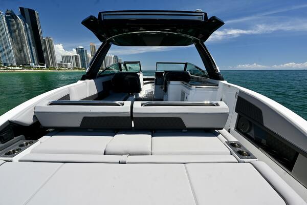 The cockpit of the R33 Cobalt is a standout space designed for both luxury and functionality. The generous L-shaped seating wraps around the port side, offering a comfortable and social layout for entertaining guests. A large aft sunpad provides a perfect spot to lounge and enjoy the view, whether at anchor or cruising. To starboard, the integrated wet bar includes a sink and storage—ideal for serving refreshments. Overhead, an integrated sunshade extends from the aft end of the hardtop at the push of a button, providing shade when needed and retracting seamlessly when you want full sun. Easy access to the transom allows for smooth transition to the swim platform, and the side boarding door adds extra convenience when docking or stepping aboard from the water. Designed with both style and practicality in mind, the cockpit is the ultimate gathering space on board.