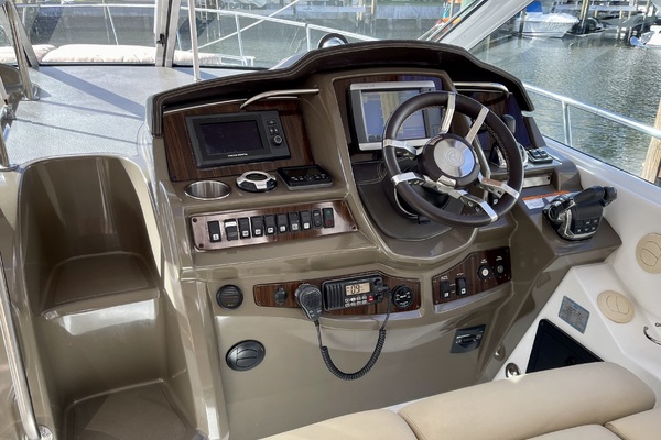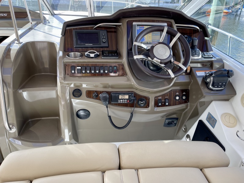 Reflecting a beautiful symmetry between ergonomic and aesthetic design, the helm of the 380 features the latest technology with the exquisite combination of rich wood grains, metallic ornamentation, stainless detailing, and a chic hand-stitched leather steering wheel and accent panels.