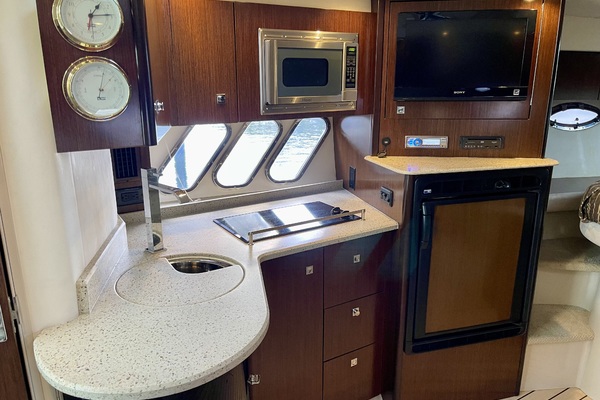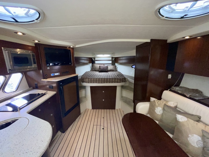 The spacious galley features attractive simulated teak flooring and granite-like solid surface countertops, with an elegant beverage/glass cabinet, microwave, two-burner electric stove, and a large refrigerator/freezer. A LCD TV and DVD entertainment center completes your on-board comfort.