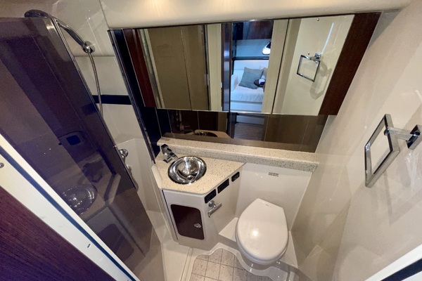 This 380 Express comes with a queen-size island berth usually not found in yachts of this category, you'll love access to either side of the bed and an inviting cushioned headboard. Also included is a large hanging locker and numerous cabinets below the bed for extra storage. A unique "tucked away" privacy curtain is standard along with a large escape hatch overhead to allow light and wind into the cabin below.