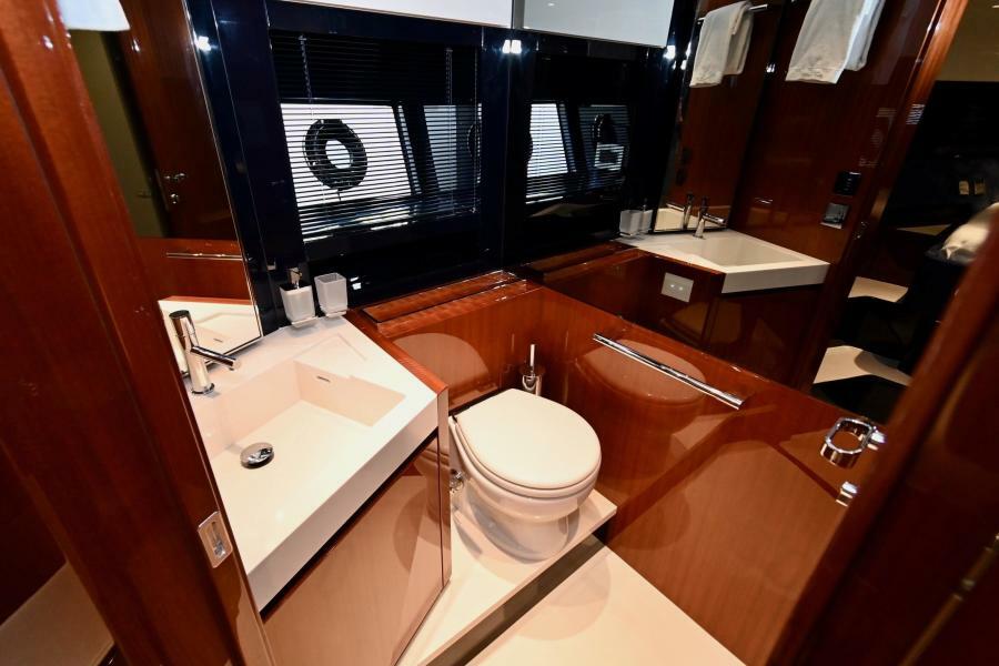 Inside Maximus, you're greeted by an interior of luxury and sophistication. High-quality materials, including glossy mahogany wood, leather upholstery, and polished metals, create an ambiance of refined elegance. The spacious main salon features a comfortable L-shaped leather sofa to starboard, positioned beneath a large window that floods the space with natural light. The day head is conveniently located aft of the settee, featuring a head and shower.