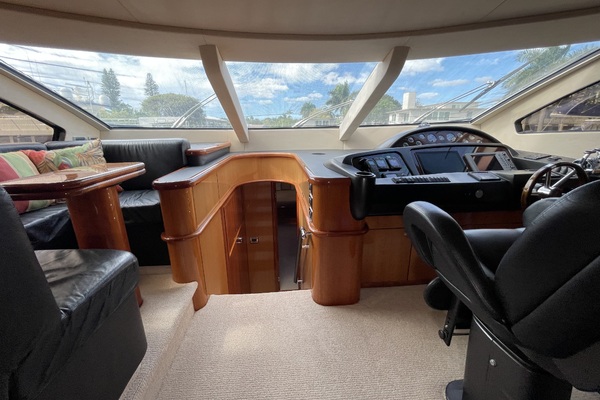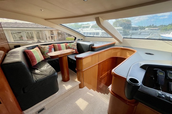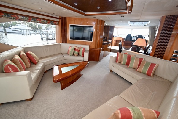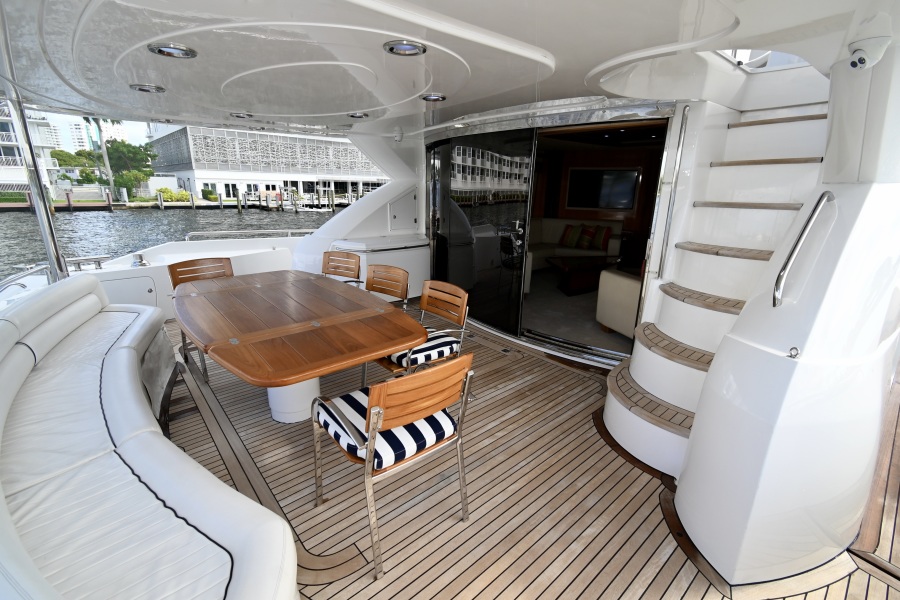 Boarding from the stern there is a hydraulic Swim platform that allows you easy access for swimming and boarding or launching a tender. The crew quarters with two bunks and 3 berths, head and shower, and engine room is easily accessed here as well.From the swim platform one would access the afterdeck up four molded steps on either sideThe aft deck has ample seating and a large teak table that will easily sit ten for a wonderful alfresco dining experience.
