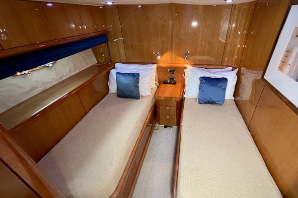 Access to the lower deck is midship and forward of the helm. Starting at the bow is a giant VIP with walk-in closet, in suite head, vanity and love seat. There is a flat screen TV and stereo system. Moving aft down the companion way are two twin stateroom Guest stateroom to port has two single berths with under berth storage and a bedside unit w/drawers.Guest stateroom to starboard has over and under single berths. Under berth storage, full hanging wardrobe.