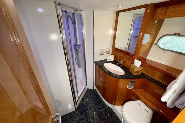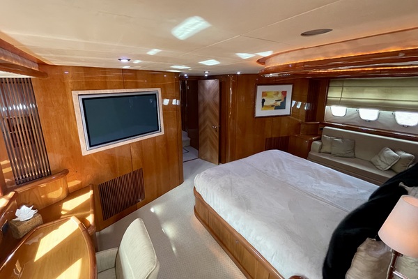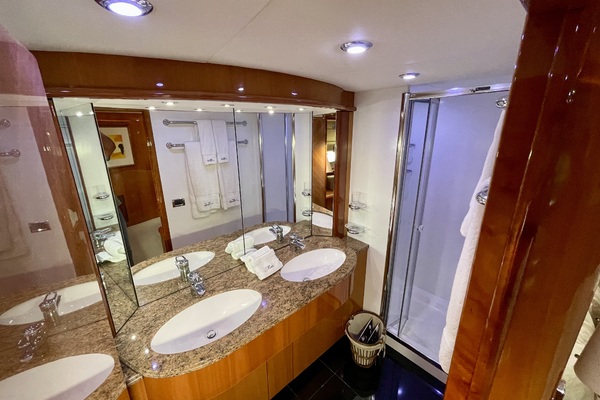 Mid ship is a full beam master, with a king size bed is facing to the bow, the master head has ample room. There is a walk in closets, vanity, and a love seat as well.